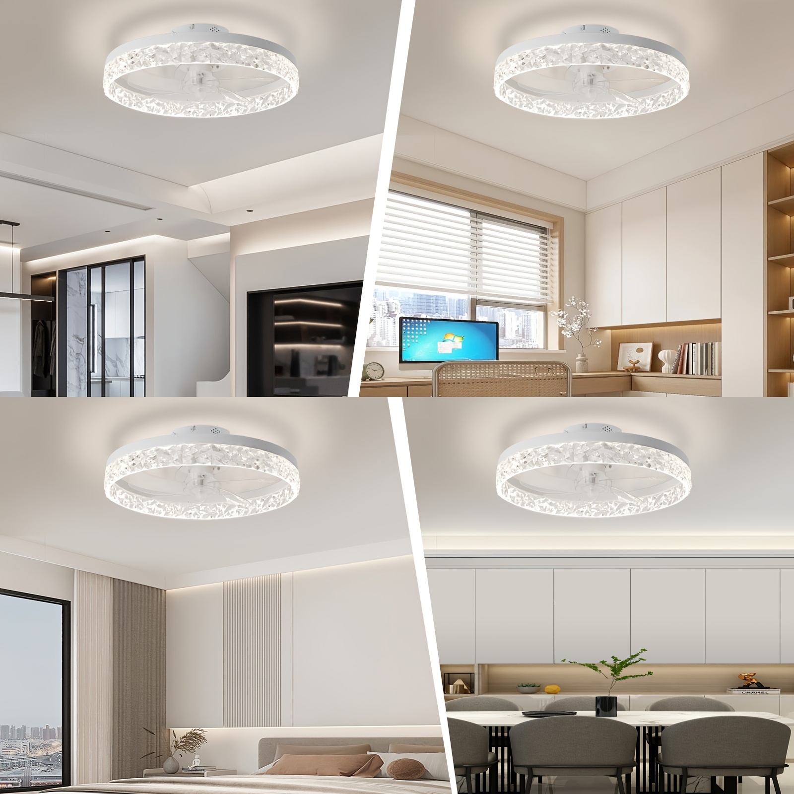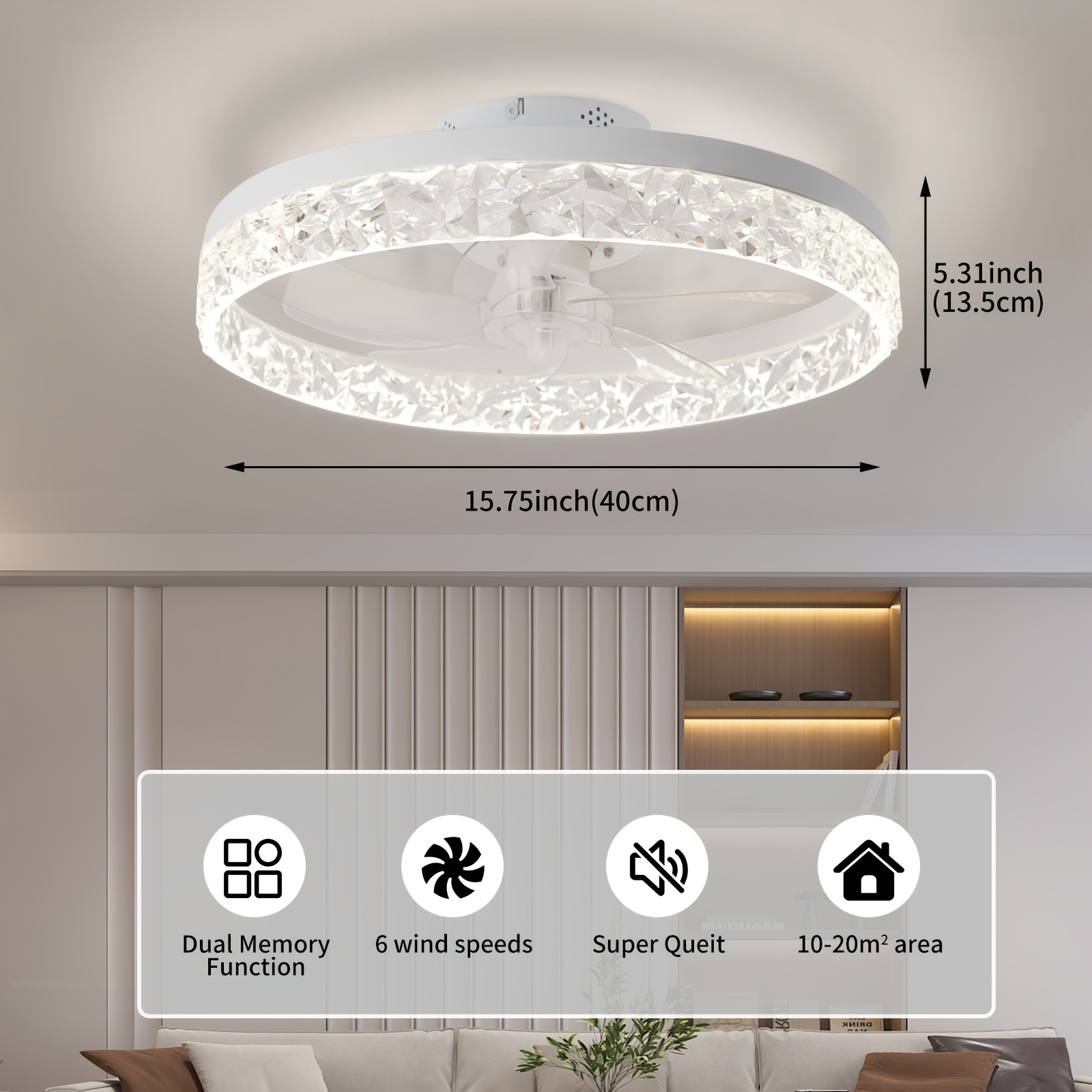 Thin Ceiling Fan with Light, 15.7-Inch Ceiling Fan with Light, Dimmable Embedded LED Fan, 3 Colors, 6-Speeds, Suitable for Bedroom, Living Room, Dining Room, Kitchen
